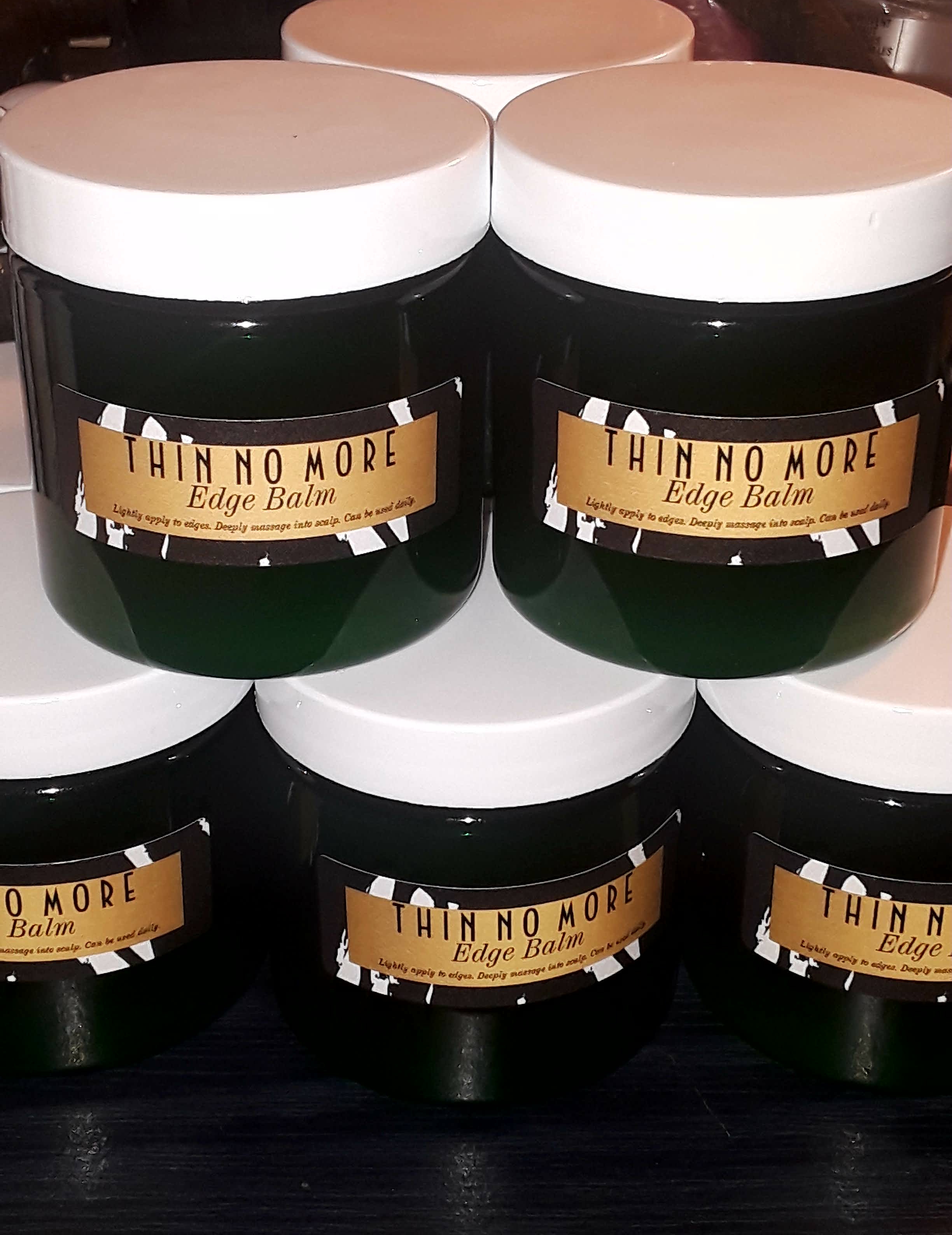 This edge balm recipie was developed to naturally stimulate hair growth. It is an option for customers who may not like applying oil. Not only does it moisturize and lightly smoothes down hair, it also keeps moisture from getting OUT of the hair. If you are regrowing your hair or losing your hair, using a little THIN NO MORE EDGE BALM may help your hair grow back faster or help you stop losing your hair in those areas.